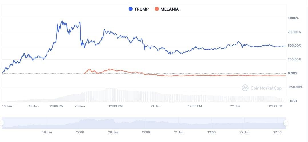 Over $21.3 billion worth of TRUMP tokens were traded over the last 24-hours, as of January 22, 2025, compared to $818.08 million worth of MELANIA tokens, data on CoinMarketCap showed.